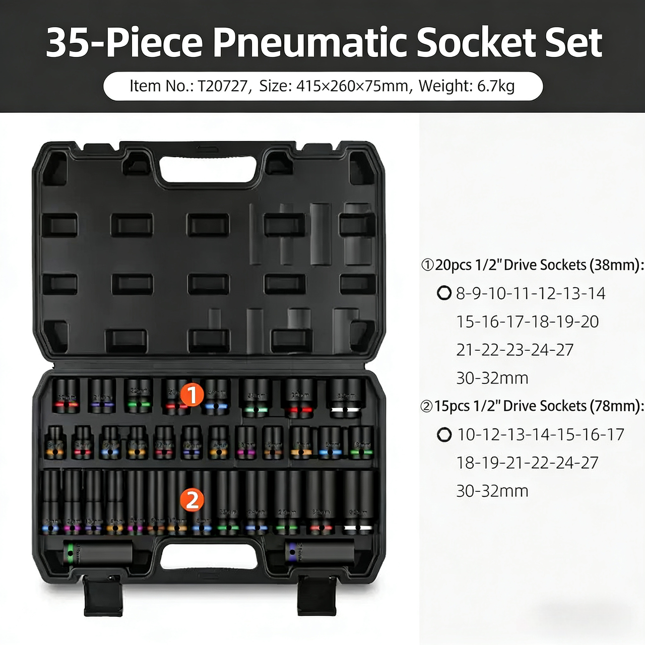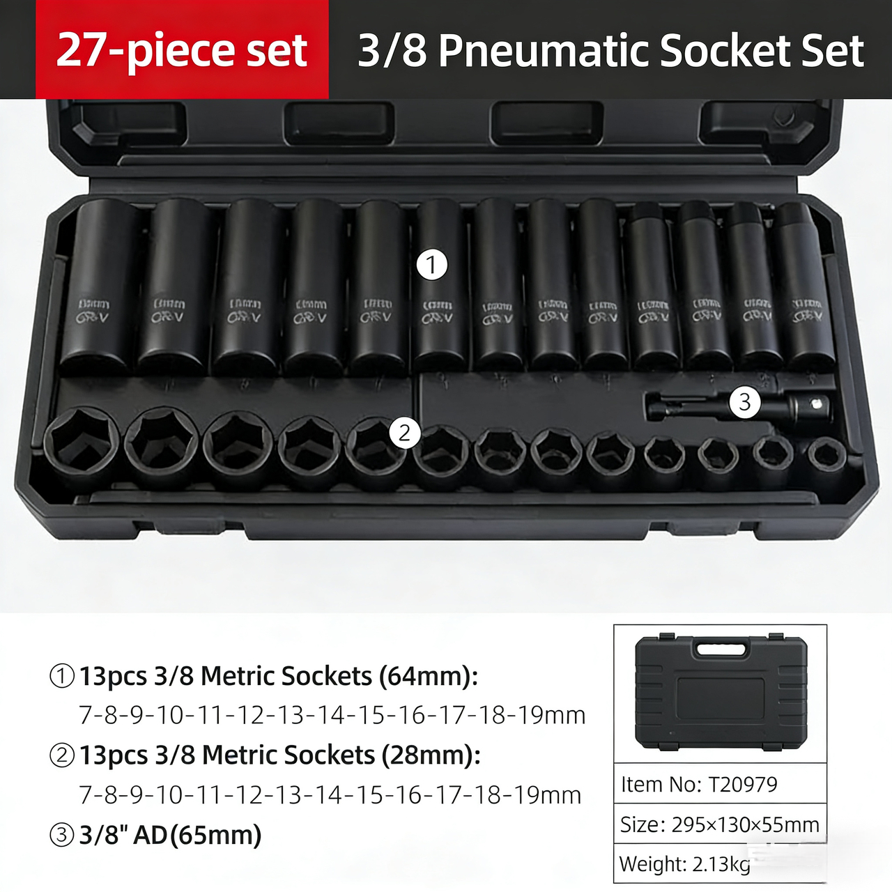 (2) 8-piece 3/8″ hex socket: 8, 10, 12, 13, 14, 15, 16, 17 mm