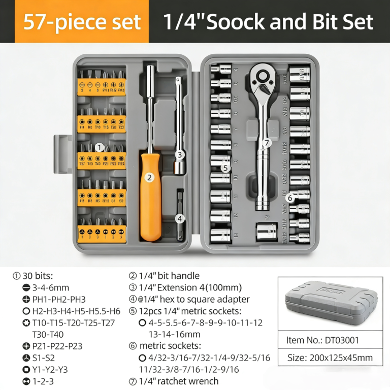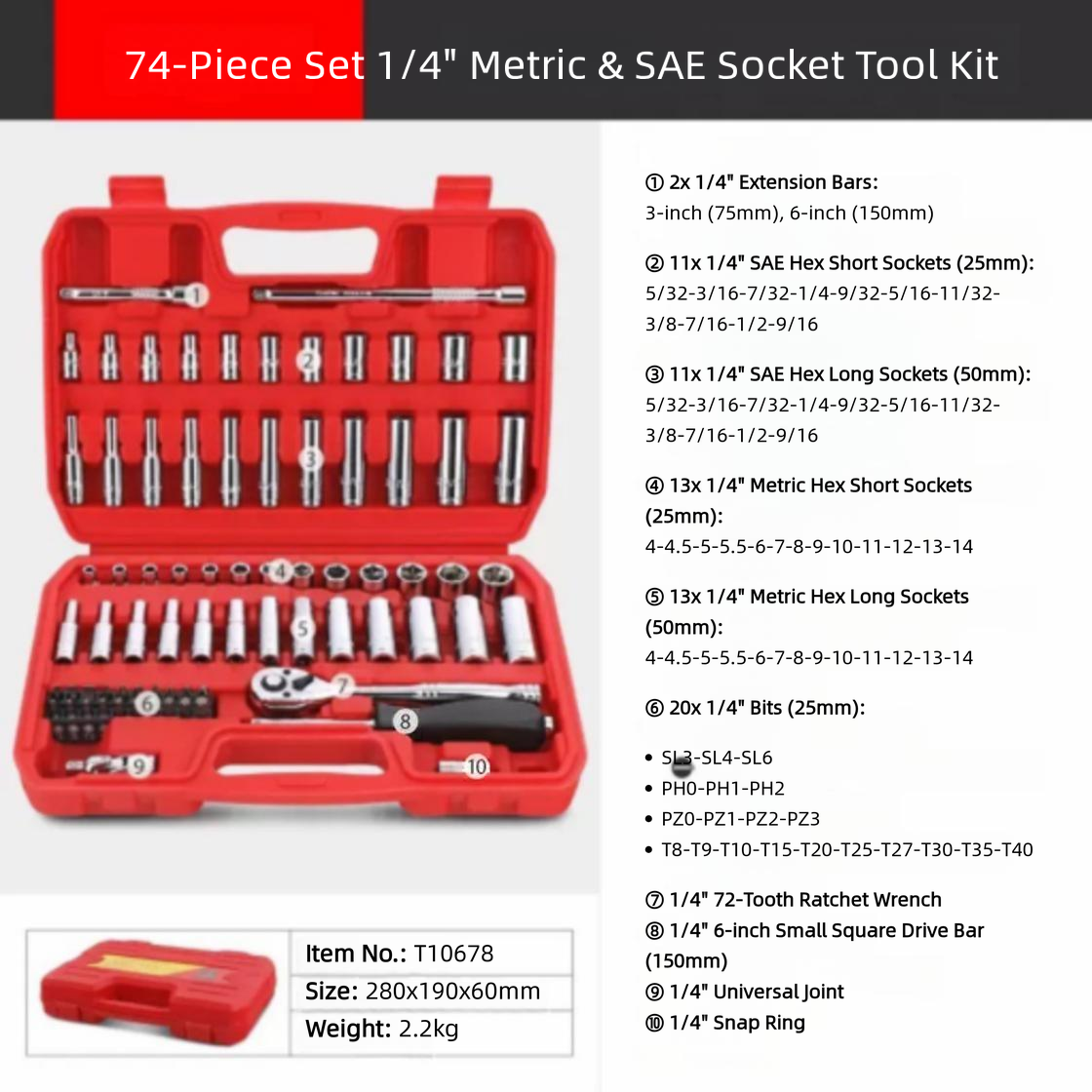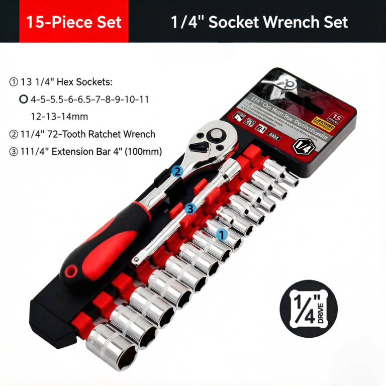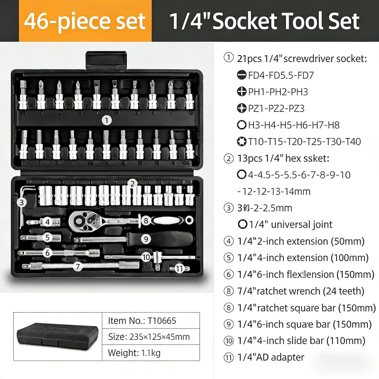 ① 13-Piece 1/4″ Hex Sockets: 4, 5, 5.5, 6, 6.5, 7, 8, 9, 10, 11, 12, 13, 14mm