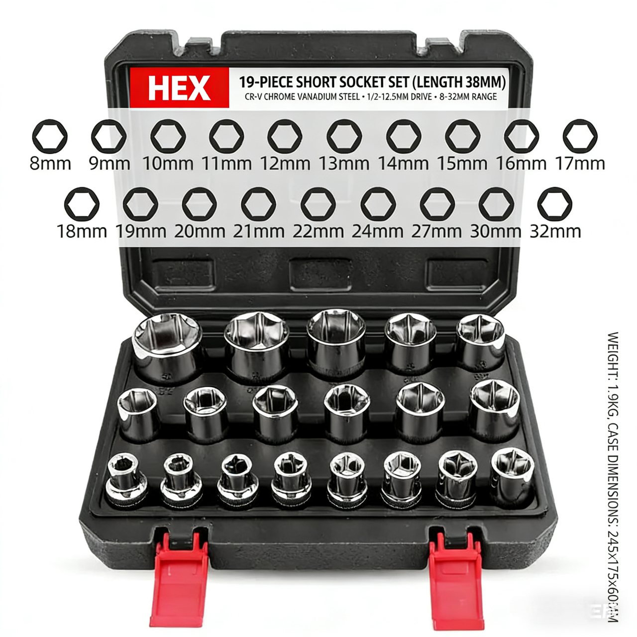(1) 10 pieces of half-inch hex sockets: 10, 12, 14, 15, 17, 19, 21, 22, 24 mm