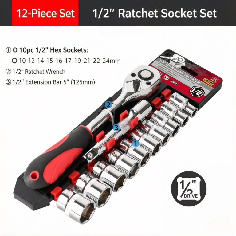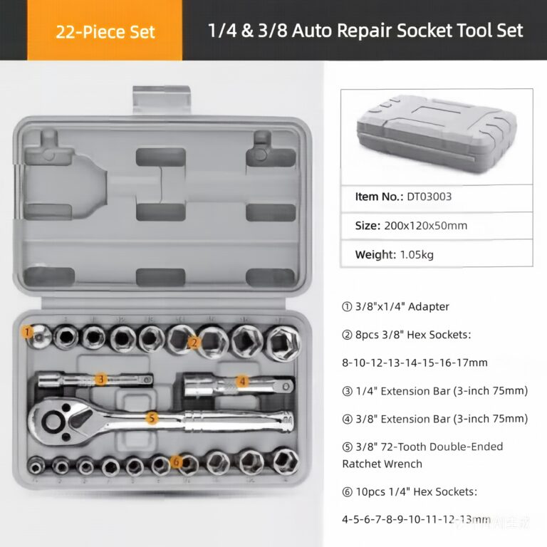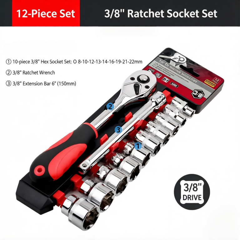 ① 10-Piece 3/8″ Hex Sockets: 8, 10, 12, 13, 14, 16, 17, 19, 21, 22mm